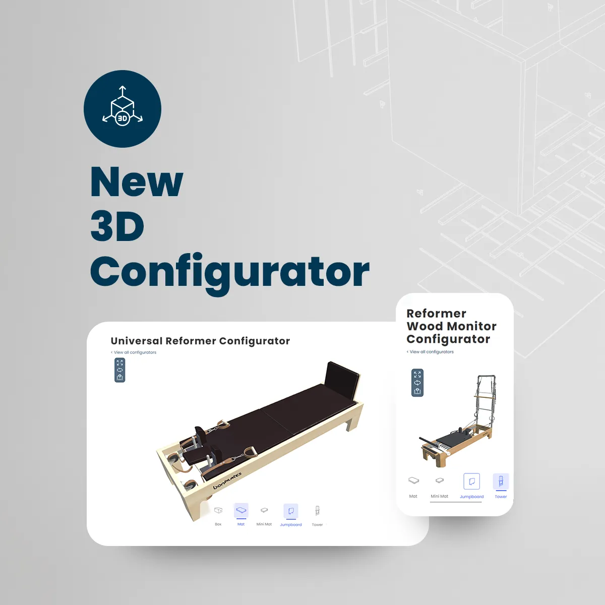 From Bonpilates we offer you our new interface so you can configure your pilates machine according to your needs and see the result in real time. With the new 3D configurator you will be able to add, configure and observe the result in 360º.